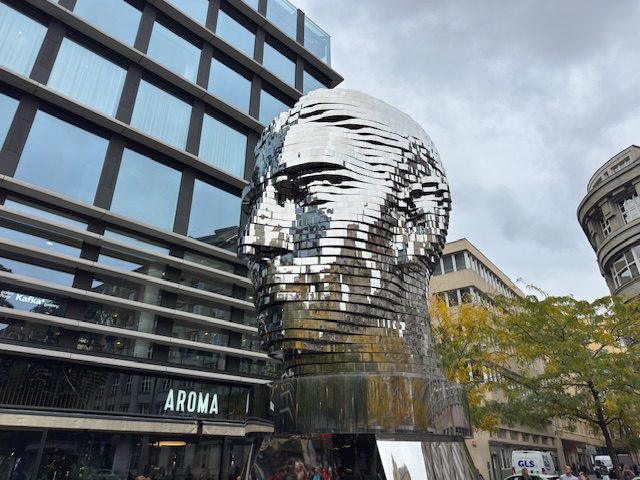 The Rotating Head located at the Quadrio shopping center is a moving sculpture by artist, David Černý. The sculpture is of Franz Kafka, a famous author born in Prague.